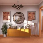 Modern cottage bedroom with patterned yellow wallpaper, green geometric wall art, a grey upholstered bed, and a small sitting area by the window