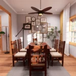 Interior of a cozy 3-bedroom cottage living area featuring modern lavender sofas, a warm glowing fireplace with a wood mantel, and light wood built-in cabinetry. The room is decorated with patterned wallpaper, mustard yellow curtains, and a large dark wood ceiling fan over hardwood floors.