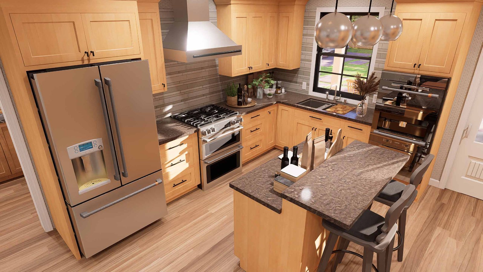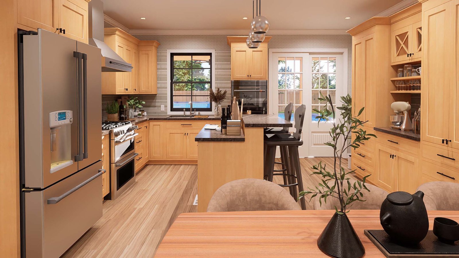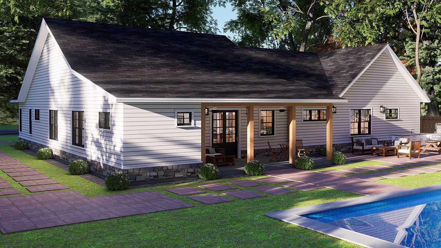 The ACB-019 Modern Cottage Plan has everything — a spacious kitchen, screened porch, and open-concept living.