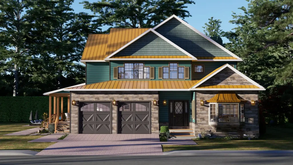 The exterior of the ACB-040CF2 immediately captures attention. It features a harmonious mix of teal siding and natural stone accents, topped with a striking roofline that nods to classic Craftsman aesthetics.